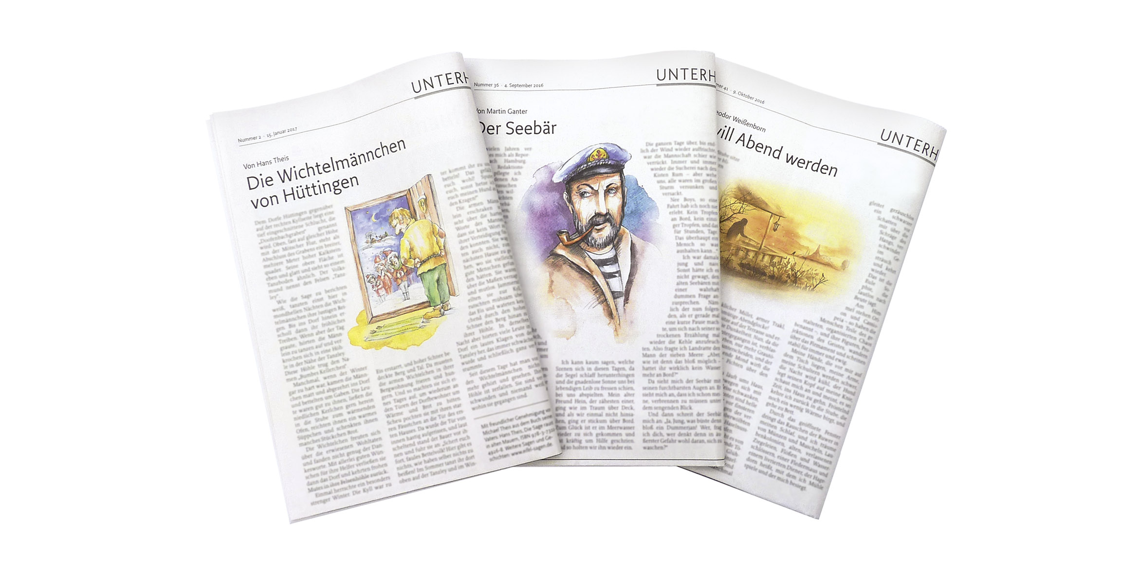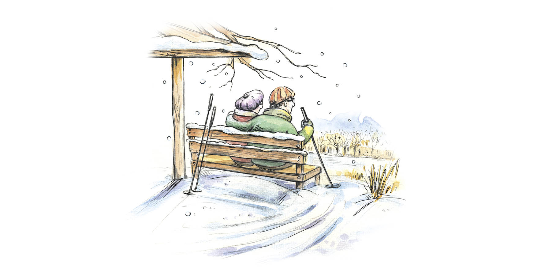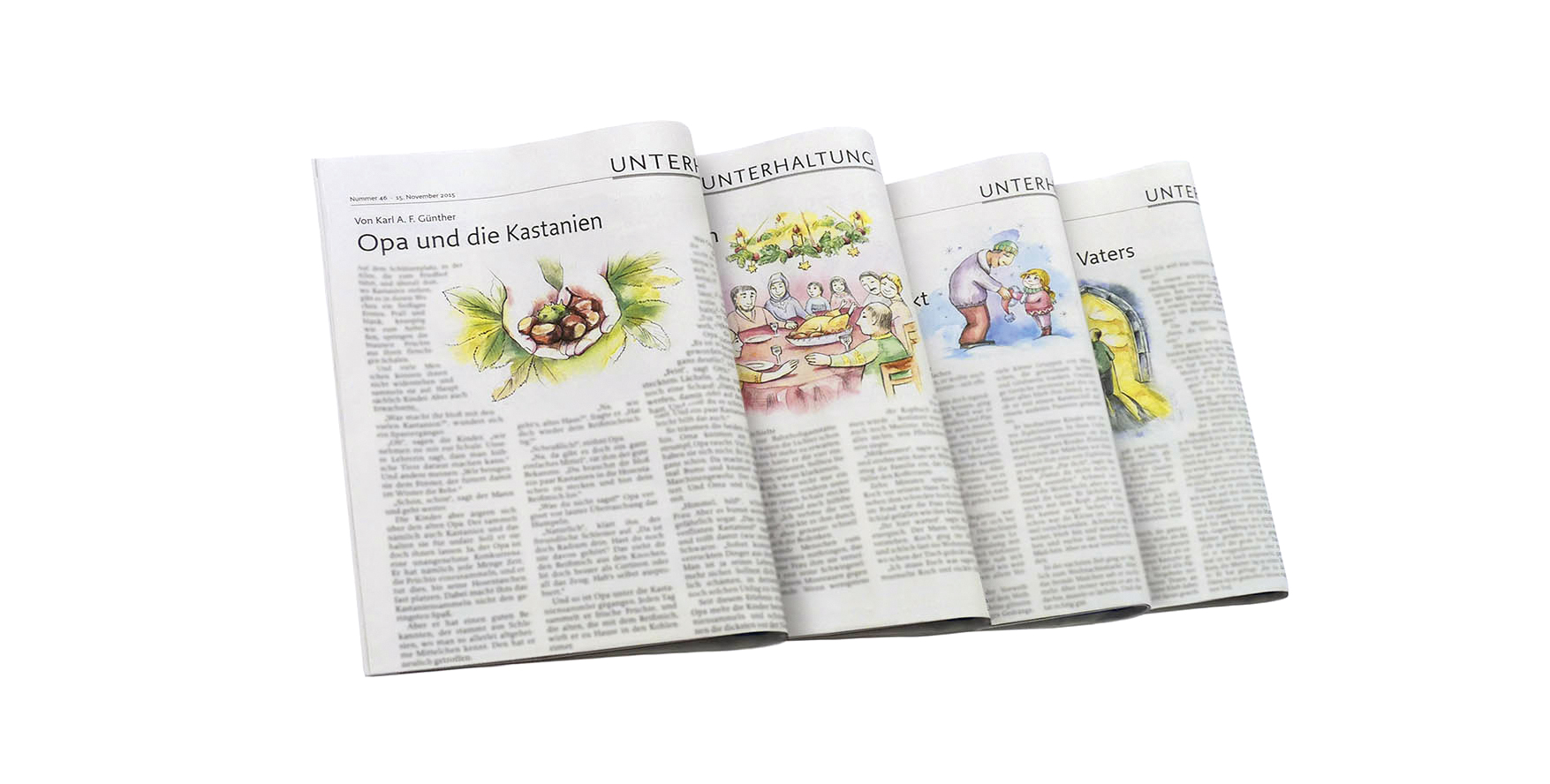 Illustration zu Geschichten «Opa und Kastanien» von Karl A. F. Günther, «Willkommen in Eisenbach» von Susanne Margraf, «Das Lächeln auf dem Weihnachtsmarkt» von Harald Müler-Baußmann, «Der Tod meines Vaters» von Thomas Fröhling